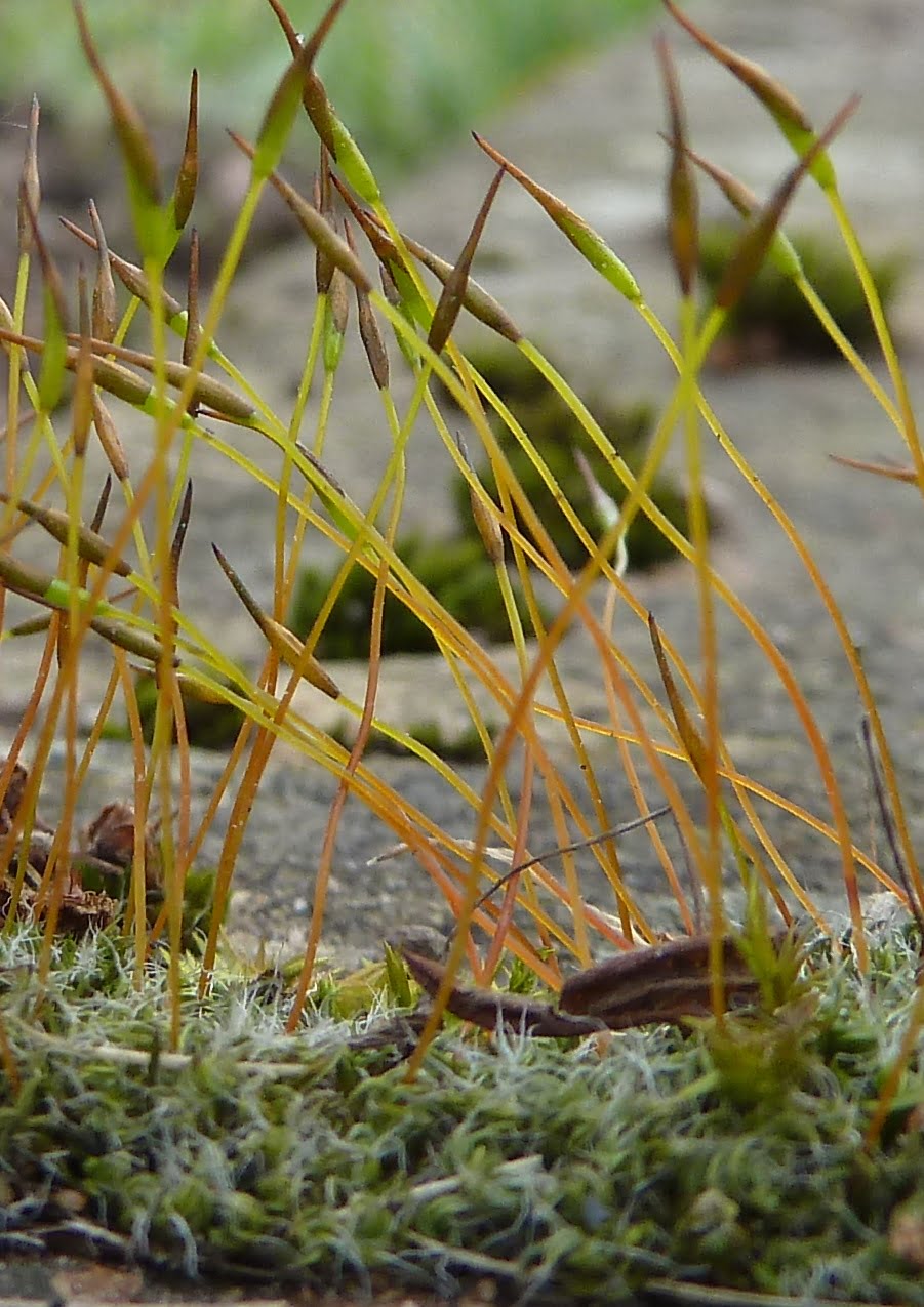 Tortula muralis – Wall screw-moss.The Screw-mosses are so named because the leaves “screw up” when dry and unscrew again when wettened. They have long silvery hair points to the leaves. The leaves of Wall Screw-moss are very small and hardly noticeable, though they open out when wet. When the plant produces its long narrow upright capsules, it is much more conspicuous.