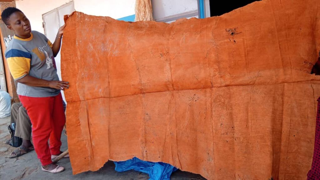 “Before the introduction of cotton cloths by the Arab Caravan traders in the nineteenth century, barkcloth was the main clothing for the people in the area and was also used as bedding, curtains and mosquito screens.