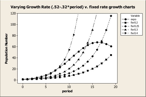 Chapter 2 is about Growth. Following the lead given in the 1970s report ‘The Limits to Growth’ commissioned by the Club of Rome, Sam Norton has much to say about how unsustainable growth can lead to overshoot and this can be the precursor to the collapse of whole communities. What’s more it doesn’t have to be energy that produces the crisis, any of a large number of stretched resources can lead to a large scale catastrophe. It is unfortunate that the standard issue growth model with constant rate is used because this inevitably gives scary results, the growth indicator increases with increasing gradient over time. In practice growth rates vary and mostly they reduce so that the growth curve reaches a peak followed by a decline even though much damage can have been experienced by this time. Exponential growth as described usually only applies to situations where there is no negative feedback, as explained in ‘Limits to Growth’. (The plot shows five examples of the exponential growth of a population, four of them with a fixed rate of growth, the other has a decreasing rate of growth. This latter growth is more typical of observed growth patterns.)