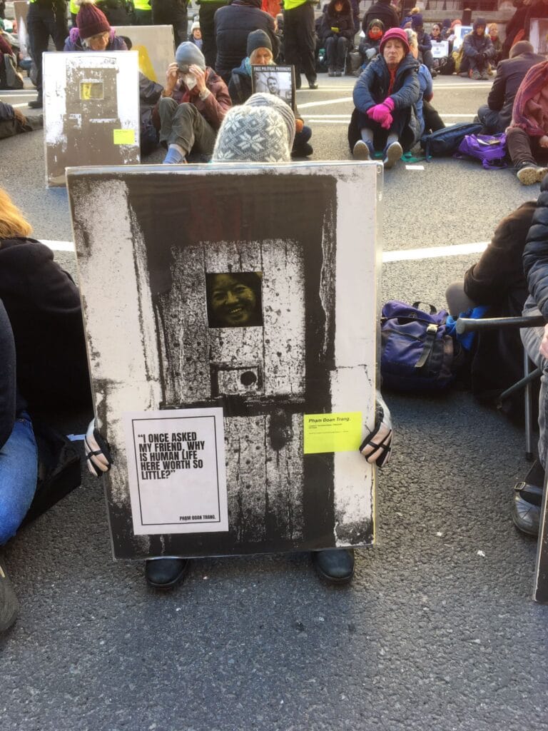 As we sat in silence on the road in three orderly lines back to back, police offices walked up and down the lines, stopping to address individuals asking them to move. “We recognise your right to protest but this is a live road”. “What can we do to make you move?” “Please move to the designated protest area in between the church of St Clement Dane and the court house”. “A section 14 notice may be imposed on this section of road and then we may arrest you”. “You might spend hours in a police cell.”